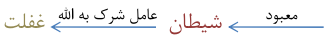غافل کسی است که این جریان را فراموس کرده ؛ جاهل کسی است که به یاد دارد (غافل نیست) اما نمی سنجد و تعقل نمی کند؛ متجاوز (ظالم و اهل علو) کسی است که به یاد دارد (غافل نیست)و می سنجد (جاهل نیست) اما حق را انتخاب نمی کند . آدمی با این سه صفت به شرک آلوده می گردد .